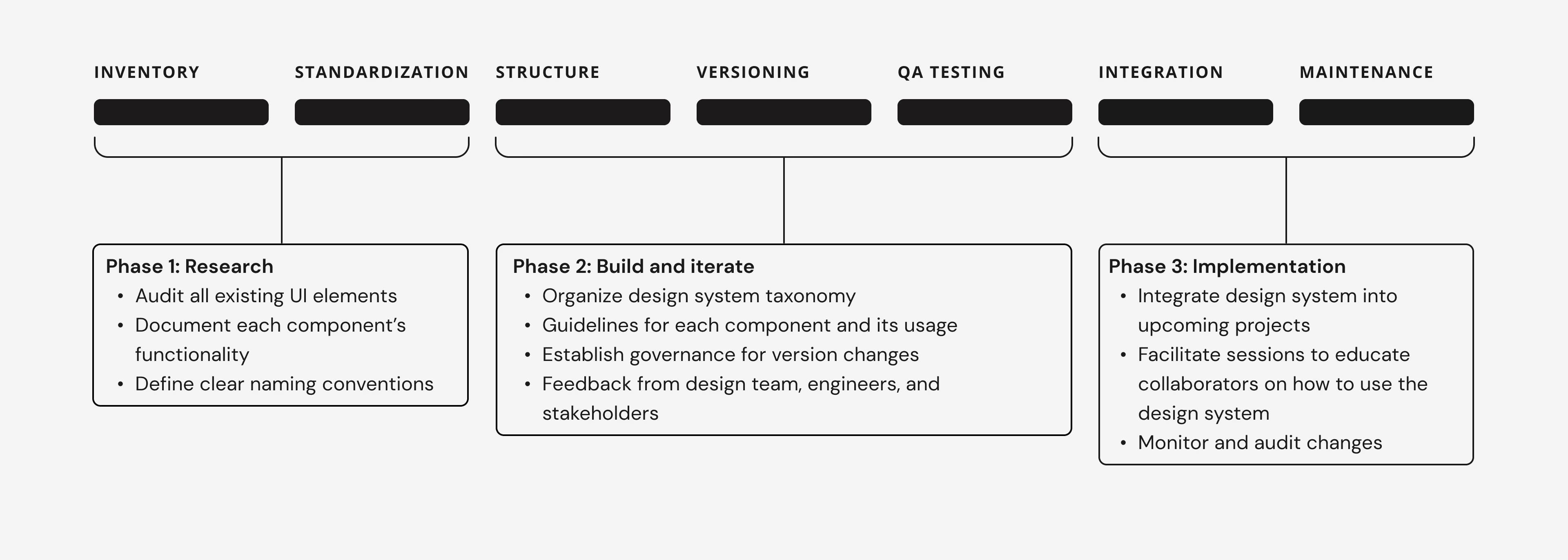 I outlined the design system process. All design system creations were not a one size fits all, so I modified the process in such a way that aligned with our team’s capacity and resources. I divided the process into phases where each designer on the team can take ownership, but other designers were more than welcome to contribute to each other’s phases.