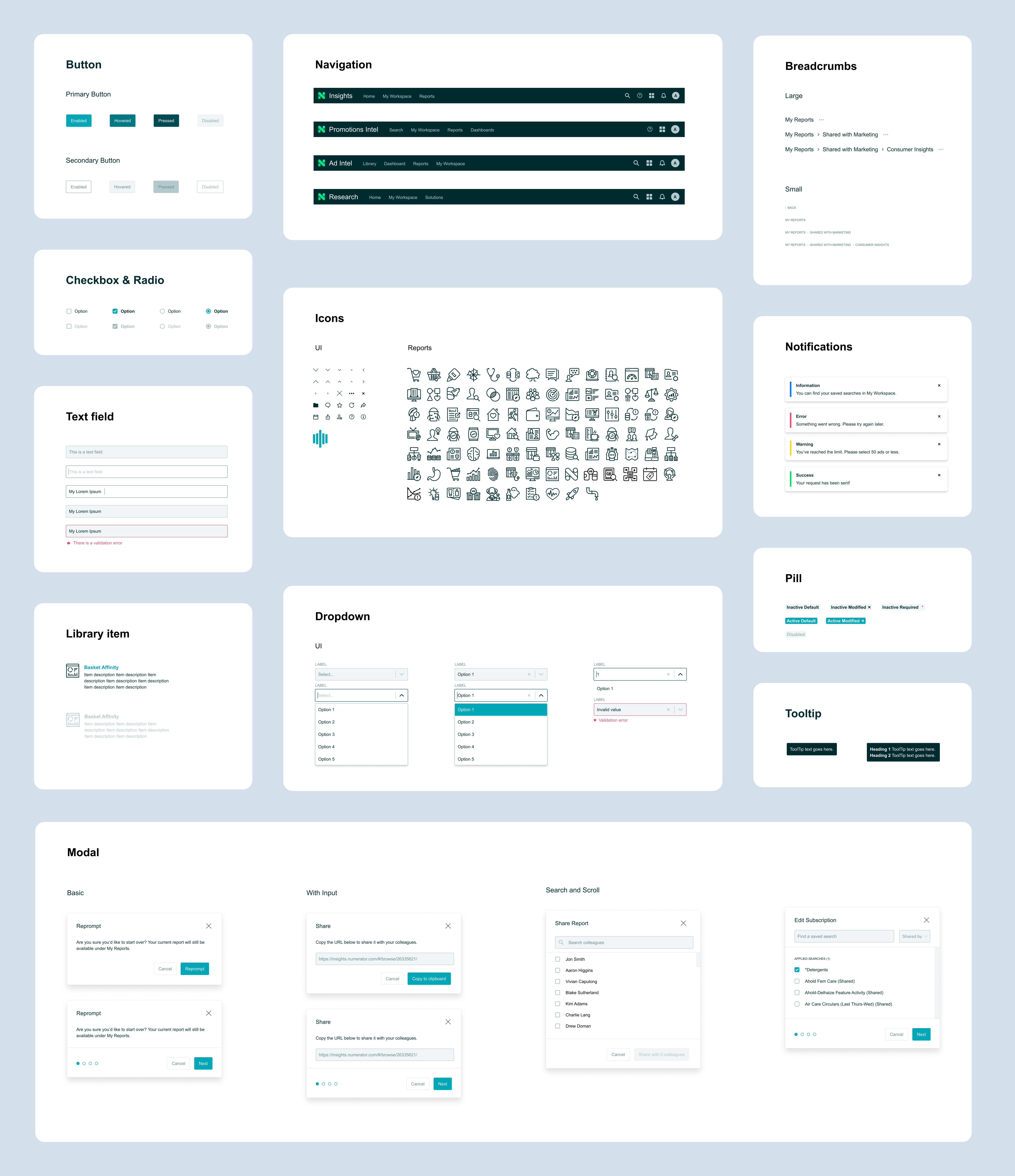 Internally, the design workflow was chaotic. Both designers and developers would have to start from scratch and create icons or colors, which was disruptive and inconsistent for many projects. The design team decided that it was time to create a centralized design system and model it after Insights, since it was Numerator’s most popular and leading product.